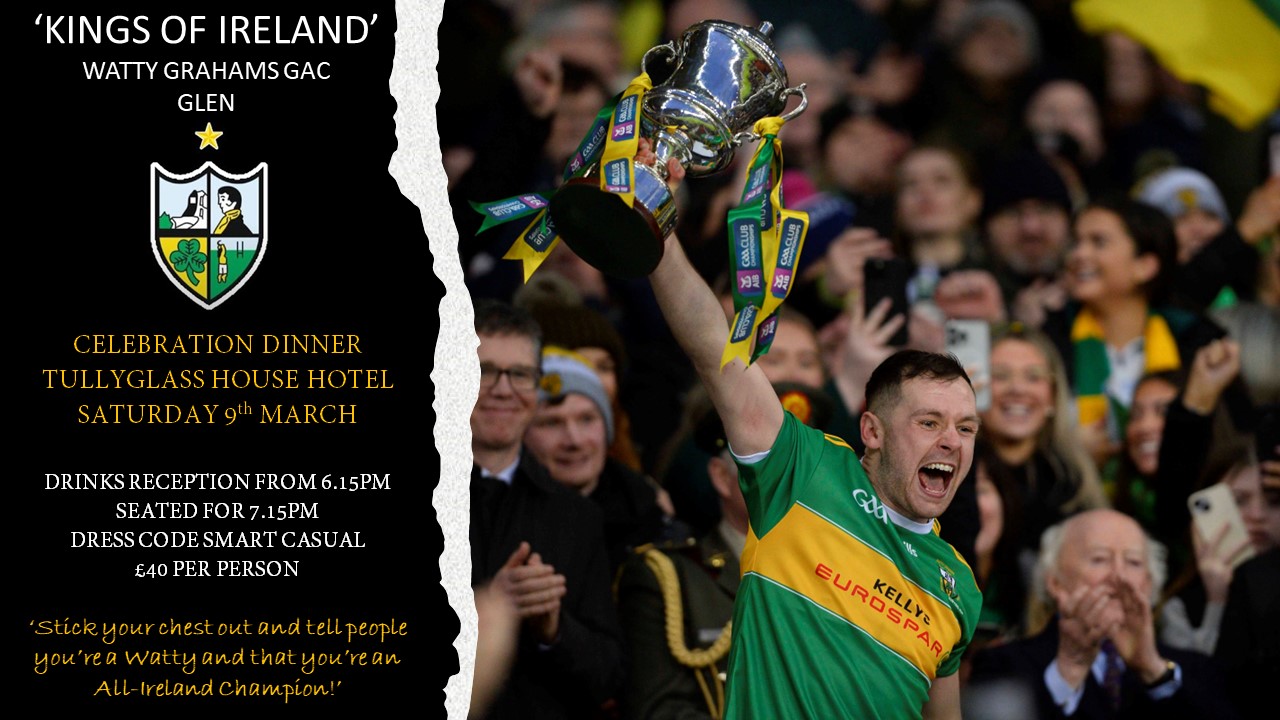 Tullyglass House Hotel, Saturday 9th March, Drinks Reception 6.15PM. Seated 7.15pm sharp. Smart Casual Dress Code. Purchase tickets at: